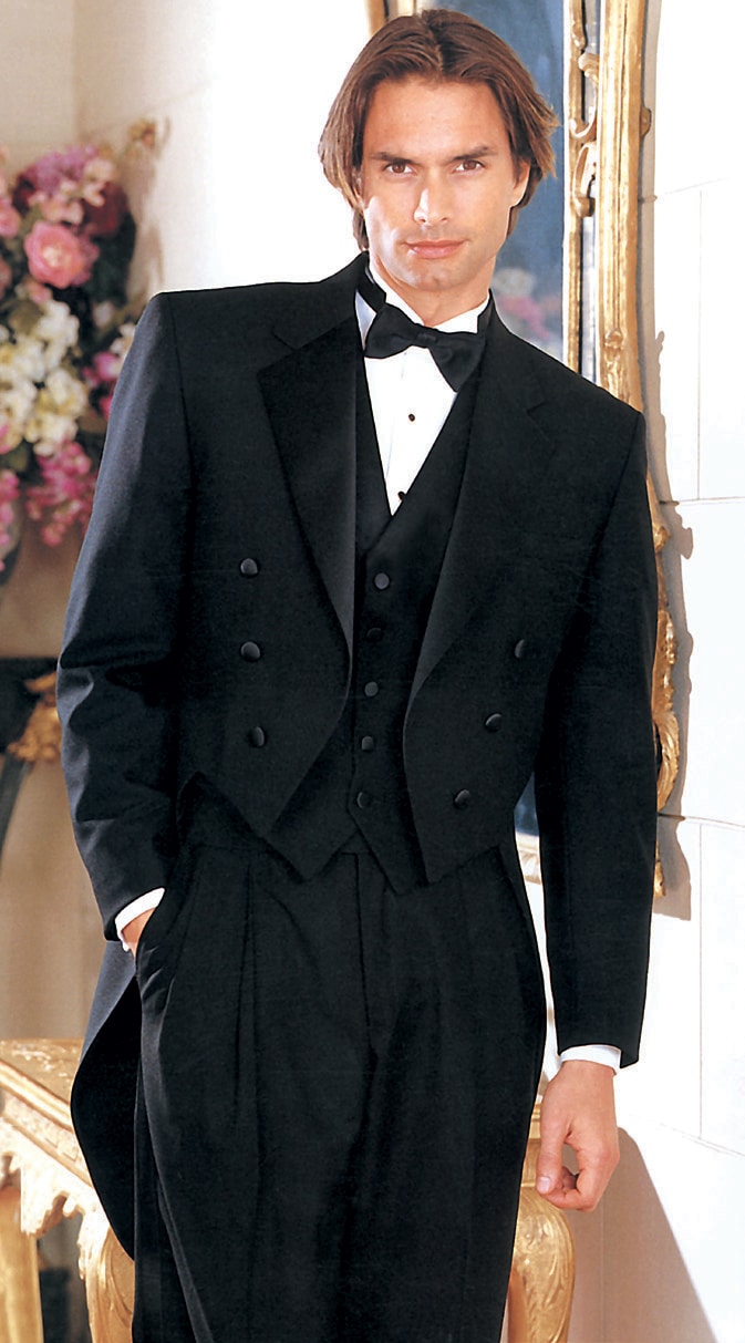 The Notch Tailcoat in black is a unique piece that combines the classic and the contemporary. With a six-button front, it is made from 100% Tropical Worsted Wool and has a classic fit. The notch lapel adds a touch of modernity to this full dress tailcoat.